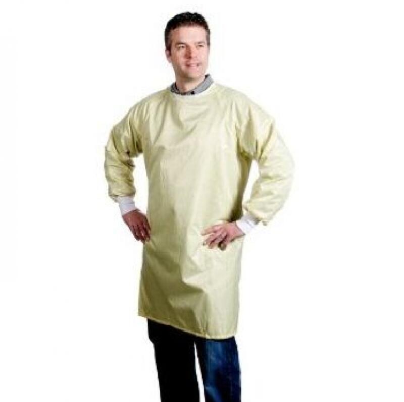Jas die over de kleding gedragen wordt ter bescherming tegen de overdracht van micro-organismen. De jas is gemaakt van non-woven polypropyleen met een polyethyleen (PE) coating, waardoor deze spatwaterdicht is.