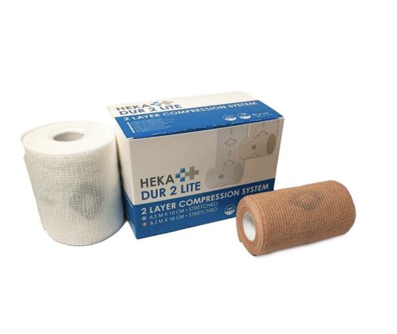 Heka Dur 2 Lite bestaat uit een witte polsterzwachtel en een bruine, zelfhechtende compressiezwachtel met indicatoropdruk. Het gaat hierbij om een niet-steriel hulpmiddel voor eenmalig gebruik. Heka Dur 2 Lite is geïndiceerd voor langdurige behandeling bij compressietherapie waarbij verminderde compressie nodig is (bij patiënten met een ABPI – ankle brachical pressure index, enkel-armindex – van 0,6-0,8). Door de korte rek heeft Heka Dur 2 Lite een hoge werkdruk en een lage rustdruk (bij mobiele patiënten). Daardoor kunnen oedemen worden verminderd. Door de beide zwachtels laagsgewijs aan te brengen, vormen deze een compressiesysteem, dat afhankelijk van de toestand van de wond en de draagtijd van het wondverband tot 7 dagen kan worden gedragen.
