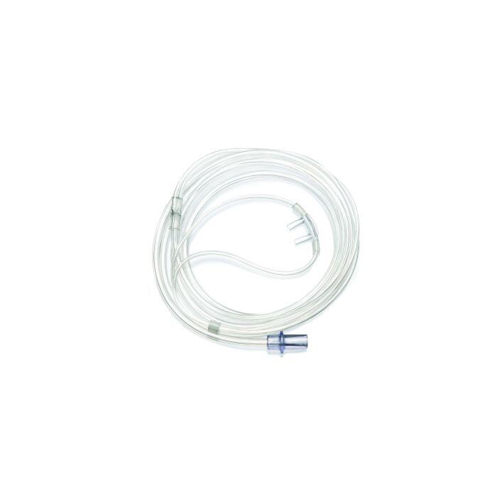 Deze zuurstofbril voor volwassenen is uitgerust met rechte prongs en een 2,1 meter lange slang. Het multi-channel ontwerp van de slang zorgt voor een continue zuurstoftoevoer, zelfs bij knikken. De bril is ftalaatvrij en geschikt voor zuurstofstromen tot 6 liter per minuut. Verpakt per 5 stuks.