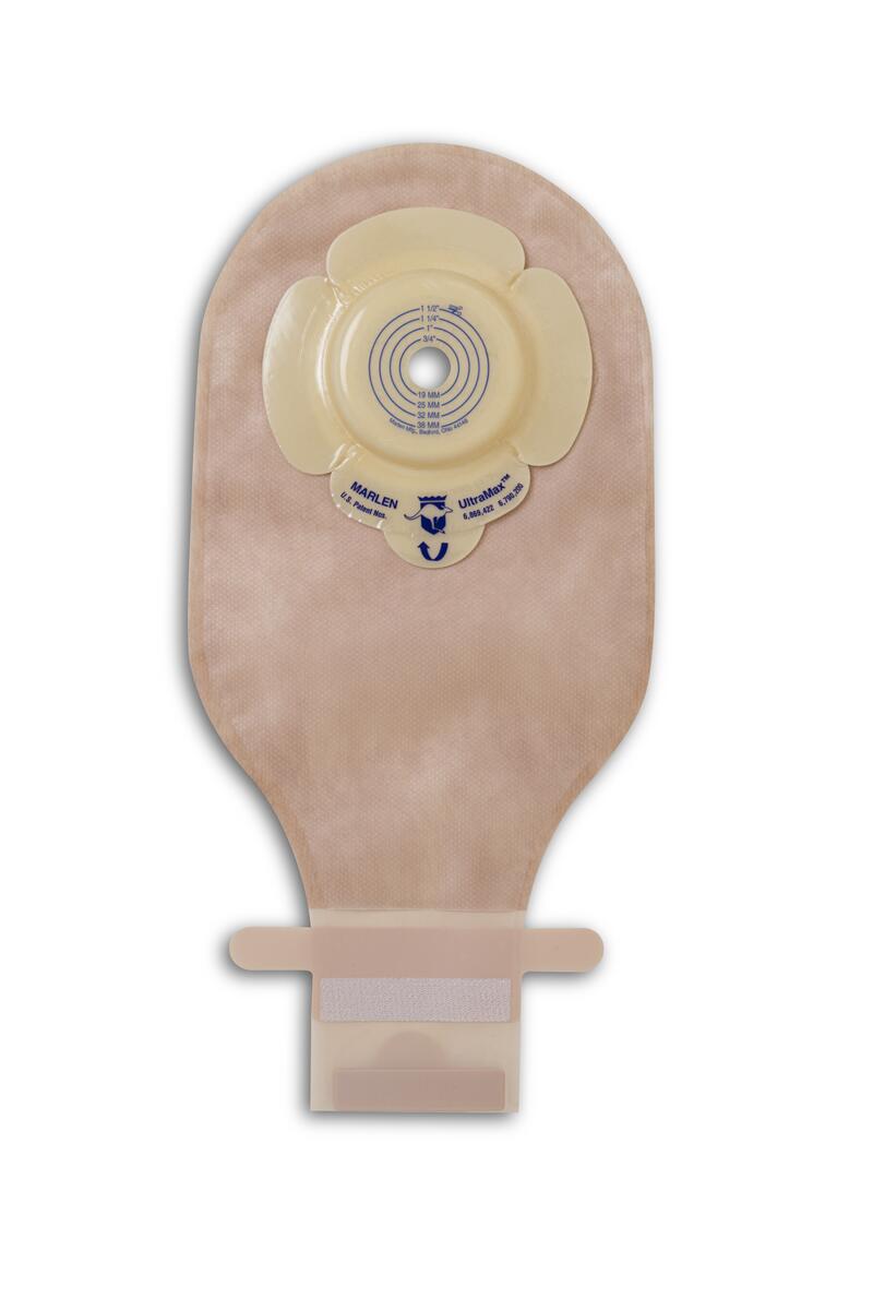 Marlen UltraMax; eendelig ileostomiesysteem bestaande uit een sterk bolvormige huidplak en een open opvangzakje; voor een stoma onder huidniveau.