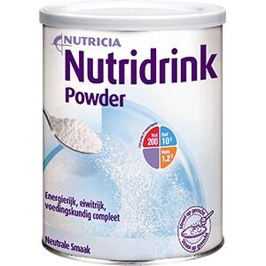 Energie- en eiwitrijke dieetvoeding in poedervorm, met vitamines, mineralen en spoorelementen, op melkbasis. Met 6 soorten voedingsvezel. Geschikt voor de patiënt die kan eten en drinken, maar bij wie normale voeding niet voldoende is of de patiënt die moet aansterken, bijvoorbeeld tijdens ziekte of een periode van herstel. 30 gram Nutridrink Powder (6 maatschepjes van circa 5 gram) per drank of gerecht levert ca. 130kcal, 6.5 gram eiwit en 9% van de ADH vitamines, mineralen en spoorelementen. Het poeder is glutenvrij en kan eenvoudig door koude en warme dranken of gerechten geroerd worden. Kan niet worden gekookt.