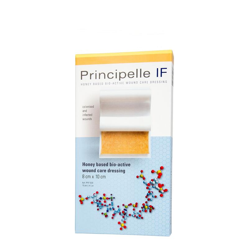 Principelle IF, geïmpregneerd, antibacterieel wondcontactlaag met honing; voor acute en chronische (geïnfecteerde) wonden.