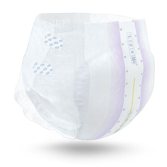 De eenmalige, anatomisch gevormde slip is voorzien van Twin Core Dry Soft Technology; dubbele pulpmat: bovenste laag verspreidt de urine, onderste laag neemt urine op. Met Air Dry Layer van een zacht en ademend materiaal en FeelDry Advanced voor een snelle absorptie, waardoor de huid minder vochtig wordt. Door de Tape Landing Zone kunnen de klittenbandstrips herhaaldelijk worden geopend en gesloten. De anatomisch gevormde beenelastieken en het Flexifit taille-elastiek laten het materiaal goed aansluiten op het lichaam. Voorzien van de Easy-Select kleurcodering voor herkenbaarheid van het absorptieniveau. De urine-indicator geeft aan wanneer de slip verzadigd is. Absorptie vlgs ISO-11948-1.